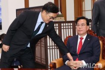 [속보] "되는것도 없는데 뭘 사진만 찍나" 송언석, 의장주재 원대 회동서 기념촬영 거부 [뉴시스Pic][서울=뉴시스] 류현주 기자 = 송언석 국민의힘 원내대표가 27일 국회의장 주재 여야 원내대표 회동에서 기념촬영을 거부하는 모습을 보였다. 우원식 국회의장은 이날 의장 집무실에서 본회의 안건 등을 조율하기 위해 김병기 더불어민주당 원내대표와 송 원내대표 간 회동을 주재했다. 이 자리에는 문진석 민주당·유상범 국민의힘 원내수석부대표도 배석했다. 우 의장이 모두발언 전 여야 원내대표 간 기념사진 촬영을 권했으나 송 원내대표는 굳은 표정으로 자리에 앉아 있었다. 이를 본 우 의장은 송 원내대표의 손을 잡아 일으키려했으나 송 원내대표는...
